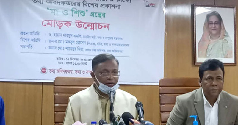 রোববার (১২ ডিসেম্বর) দুপুরে সচিবালয়ের ক্লিনিক ভবনে তথ্য অধিদপ্তরের সম্মেলন কক্ষে মুজিবর্ষ ও স্বাধীনতার সুবর্ণজয়ন্তী উপলক্ষে তথ্য অধিদপ্তরের বিশেষ প্রকাশনা ‘মা ও শিশু’ গ্রন্থের মোড়ক উন্মোচন অনুষ্ঠানে সাংবাদিকদের এক প্রশ্নের জবাবে ড. হাছান মাহমুদ এ কথা বলেন।।
