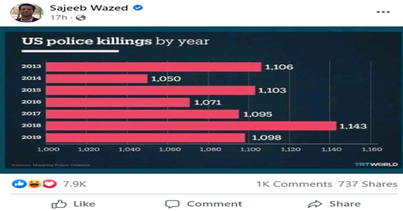 রোববার (১২ ডিসেম্বর) রাতে নিজের ভেরিফায়েড ফেসবুক পেজে তুরস্কভিত্তিক সংবাদমাধ্যম টিআরটি ওয়ার্ল্ডের একটি ছক উপস্থাপন করেন তিনি। যেখানে ২০১৩ থেকে ২০১৯ সাল পর্যন্ত দেশটিতে পুলিশের হাতে নিহতের সংখ্যা উল্লেখ করা আছে।