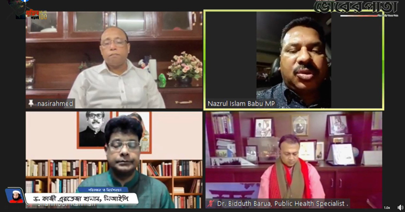 দৈনিক ভোরের পাতার নিয়মিত আয়োজন ভোরের পাতা সংলাপের ৫৫৪তম পর্বে বুধবার এসব কথা বলেন আলোচকরা। ভোরের পাতা সম্পাদক ও প্রকাশক ড. কাজী এরতেজা হাসানের নির্দেশনা ও পরিকল্পনায় অনুষ্ঠানে আলোচক হিসেবে উপস্থিত ছিলেন- সংসদ সদস্য, বাংলাদেশ ছাত্রলীগের সাবেক সাধারণ সম্পাদক নজরুল ইসলাম বাবু, ইসলামী বিশ্ববিদ্যালয়ের ইংরেজি বিভাগের অধ্যাপক ড. শাহিনূর রহমান, বাংলাদেশ আওয়ামী লীগের স্বাস্থ্য বিষয়ক উপ-কমিটির সদস্য, চট্টগ্রাম ফিল্ড হাসপাতালের প্রধান উদ্যোক্তা ডা. বিদ্যুৎ বড়ুয়া। অনুষ্ঠানটি সঞ্চালনা করেন সাবেক তথ্য সচিব নাসির উদ্দিন আহমেদ।