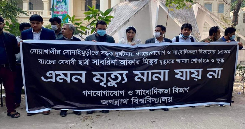 নোয়াখালীর সোনাইমুড়ীতে ট্রাক চাপায় জগন্নাথ বিশ্ববিদ্যালয়ের গণযোগাযোগ ও সাংবাদিকতা বিভাগের শিক্ষার্থী সাবরিনা আক্তার মিতু মারা যাওয়ার ঘটনায় দায়ীদের বিচারের দাবিতে মানববন্ধন করেছে শিক্ষক-শিক্ষার্থীরা। রবিবার সকাল ১১ টায় বিশ্ববিদ্যালয়ের শহীদ মিনার প্রাঙ্গণে গণযোগাযোগ ও সাংবাদিকতা বিভাগের আয়োজনে এ মানববন্ধন করা হয়।
