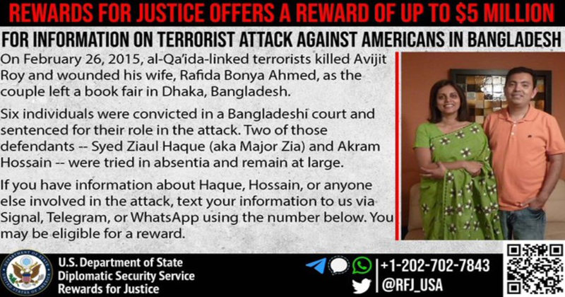২০১৫ সালে ব্লগার ও লেখক অভিজিৎ রায়কে হত্যার মূল পরিকল্পনাকারী বলে যাদের সন্দেহ করা হয়- সেই ‘মেজর জিয়া’ নামে পরিচিত সৈয়দ জিয়াউল হক এবং আকরাম হোসেনের ব্যাপারে তথ্য দেওয়ার জন্য ৫৫ লক্ষ ডলার পুরস্কার ঘোষণা করেছে মার্কিন পররাষ্ট্র দফতর।