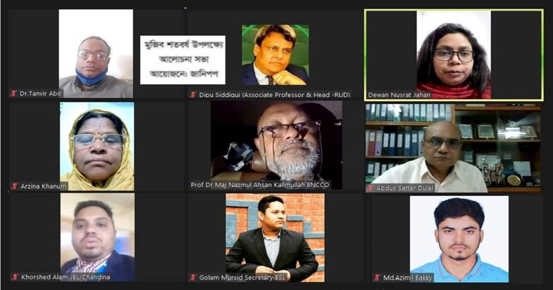 মুজিব শতবর্ষ উপলক্ষ্যে আজ মঙ্গলবার (২১ ডিসেম্বর) জানিপপ কর্তৃক আয়োজিত বর্ষকালব্যপী জুম ওয়েবিনারে আলোচনা সভার ১৪২তম পর্ব অনুষ্ঠিত হয়।