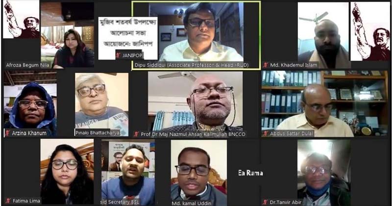 মুজিব শতবর্ষ উপলক্ষ্যে আজ সোমবার (২৭ ডিসেম্বর) জানিপপ কর্তৃক আয়োজিত বর্ষকালব্যপী জুম ওয়েবিনারে আলোচনা সভার ১৪৮তম পর্ব অনুষ্ঠিত হয়।