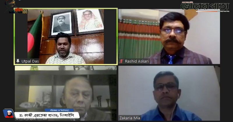 দৈনিক ভোরের পাতার নিয়মিত আয়োজন ভোরের পাতা সংলাপের ৫৭০তম পর্বে শুক্রবার (৩১ ডিসেম্বর) এসব কথা বলেন আলোচকরা। ভোরের পাতা সম্পাদক ও প্রকাশক ড. কাজী এরতেজা হাসানের নির্দেশনা ও পরিকল্পনায় অনুষ্ঠানে আলোচক হিসেবে উপস্থিত ছিলেন- ইসলামী বিশ্ববিদ্যালয়, কুষ্টিয়ার সাবেক উপাচার্য অধ্যাপক ড. মো. হারুন-উর-রশিদ আসকারী, জগন্নাথ বিশ্ববিদ্যালয়ের মাইক্রোবায়োলজি বিভাগের চেয়ারম্যান, প্রগতিশীল শিক্ষক সংগঠন জগন্নাথ বিশ্ববিদ্যালয়ের (নীলদল) সাবেক সভাপতি, লাইফ এন্ড আর্থ সাইন্স অনুষদের প্রাক্তন ডিন অধ্যাপক ড. জাকারিয়া মিয়া, বেলজিয়াম আওয়ামী লীগের উপদেষ্টা, বেলজিয়াম বঙ্গবন্ধু পরিষদের সভাপতি অধ্যাপক ড. ফারুক মির্জা। অনুষ্ঠানটি সঞ্চালনা করেন ভোরের পাতার বিশেষ প্রতিনিধি উৎপল দাস।