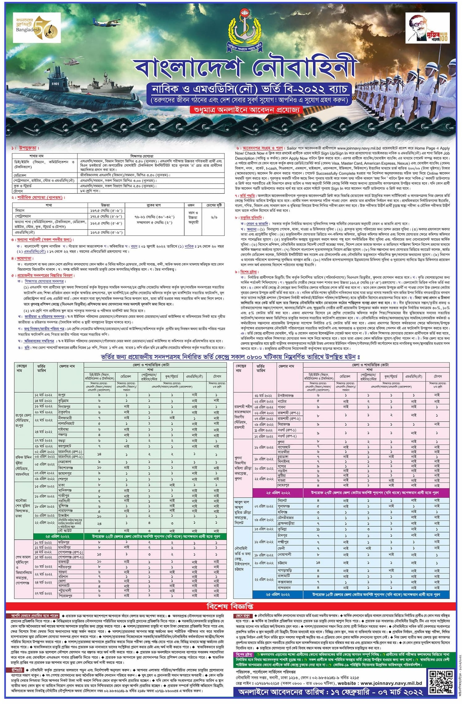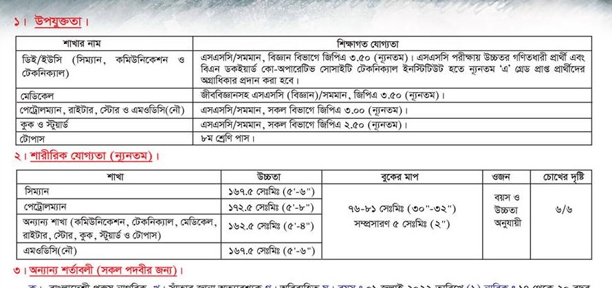 প্রার্থীকে অবশ্যই বাংলাদেশের নাগরিক হতে হবে, অবিবাহিত হতে হবে এবং সাঁতার জানতে হবে। প্রার্থীর বয়স ০১ জুলাই ২০২২ তারিখে নাবিক এর ক্ষেত্রে ১৭ থেকে ২০ বছর এবং এমওডিসি (নৌ) এর ক্ষেত্রে ১৭ থেকে ২২ বছরের মধ্যে হতে হবে।