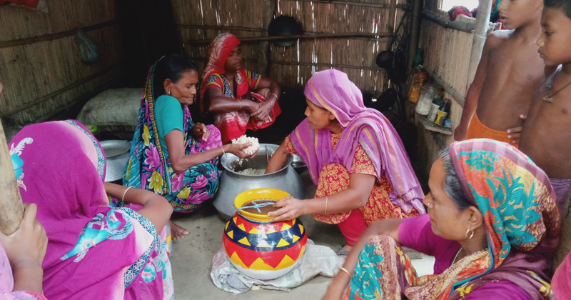 জয়নদ্দিন সরদার পাড়া গ্রামে ফরিদা বেগম, ভানু বেগম, ও সুফিয়া বেগম সহ কয়েক জন নারী গুড় ও ধানের খই মিশাতে ব্যাস্ত সময় পার করছেন কেও চুলায় গুড় জাল দিচ্ছে আবার কেও খৈইয়ের মধ্যে থাকা দু একটি ধান বেছে পরিস্কার করছে। তারা যাবে দেবগ্রাম ইউনিয়নের চেনাপেঁচা গ্রামে নাতি জুবায়ের শেখের বিয়ের অনুষ্ঠানে। তাই গ্রাম বাংলার ঐতিহ্য বিয়ের অনুষ্ঠানে ধানের খইয়ের মোয়া তৈরি করছে।