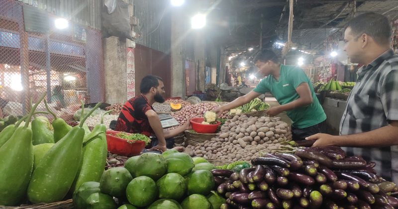 সবজি বিক্রেতা মোঃ আব্দুল খালেক গত এক সপ্তাহ আগে সবজির দাম েবশ ছিল।এখন অনেকটা দাম কমেছে।এক কেজি ফুলকপি সপ্তাহ আগে বিক্রি হত ১৬০ টাকা এখন তা কমে মাত্র ৬০ টাকা বিক্রি হচ্ছে। এরকম অনান্য শাক সবজির দাম গড়ে ১০-১২ টাকা কমেছে।তবে কাঁচা মরিচের দাম প্রতি কেজি ৪০ টাকা থেকে বেড়ে ৬০ টাকা আর পিঁয়াজের দাম ৩৫ টাকা থেকে ৫০ টাকা দরে বিক্রি হচ্ছে।