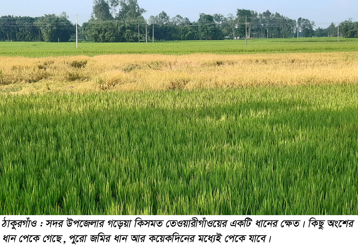 ঠাকুরগাঁও কৃষি সম্প্রসারণ অধিদপ্তরের উপ পরিচালক কৃষিবিদ আবু হোসেন জানান, অন্যান্য ফসলের ন্যয় ধানের জন্যও বিখ্যাত এ জেলা। প্রচুর পরিমানে ধান এ জেলায় উৎপাদন হয়। প্রত্যেক বছরের ন্যয় এ বছরও কৃষকদের যাবতীয় কৃষি সেবা প্রদান করা হয়। বৃষ্টি, সম্পুরক সেচ ব্যবস্থা চালু ও সেচ পাম্পগুলিও সচলের মাধ্যমে পানির চাহিদা পূরণ হয়েছে। ইতিমধ্যে বেশ কিছু স্থানে ধান কেটে ঘরে তুলেছেন কৃষকেরা। বাকীগুলোও অল্প কিছুদিনের মধ্যেই কাটা-মাড়াইয়ের কাজ শুরু হবে। সবকিছু ঠিক থাকলে লক্ষ্যমাত্রার অতিরিক্ত ধান উৎপাদন হবে এবং কৃষকেরা এ বছরও ধানের ন্যর্য্য মুল্য পাবেন বলে প্রত্যাশা ব্যক্ত করেন তিনি।