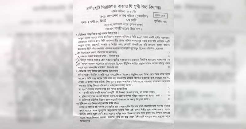 এটি সিরাজগঞ্জের তাড়াশের রানীরহাট সিরাজগঞ্জ বাজার দ্বি-মূখী উচ্চ বিদ্যালয়ের ৮ম শ্রেণির বার্ষিক পরীক্ষার বাংলাদেশ ও বিশ^ পরিচয় (সৃজনশীল) প্রশ্ন পত্রের ১ নং ক্রমিকের উদ্দিপক। যা পড়ে নিচের প্রশ্ন গুলোর উত্তর দিতে হবে এমনই প্রশ্ন পত্র প্রণয়ন করে ওই বিদ্যালয়ের প্রধান শিক্ষক আব্দুল মমিন তালম ইউনিয়নের চেয়ারম্যান আব্দুল খালেক কে নিয়ে তেলবাজি করেছেন।