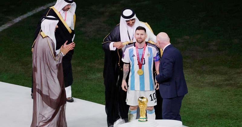 স্বপ্নের সোনালী ট্রফিটা ছাড়া ফুটবল–ক্যারিয়ারের সম্ভাব্য সবই ছিল তার শোকেসে। কিন্তু একটা বিশ্বকাপের হাহাকার শুধু দীর্ঘই হচ্ছিল। ফ্রান্সের বিপক্ষে জয় নিশ্চিতের পর যখনই ট্রফিটা ছুঁতে যাবেন, তখনই মেসিকে ডেকে নিলেন কাতারের আমির তামিম বিন হামাদ। পরিয়ে দিলেন ‘আলখাল্লা’।