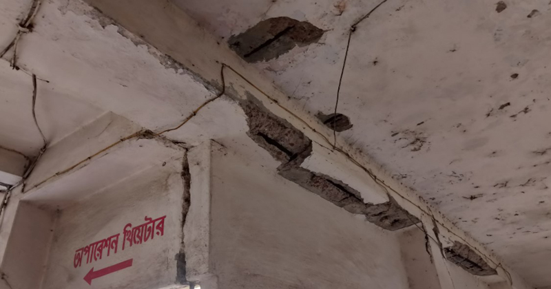 সরেজমিনে, হাসপাতালের প্রবেশদ্বারের সিলিং এ বড় ধরণের ফাটল, ইতিমধ্যে ভেঙ্গে পড়েছে বড় একটি অংশ। তাছাড়া দ্বিতীয় তলার সিড়ি সংলগ্ন, পুরুষ, মহিলা ওয়ার্ড ও স্টাফ রুমের সিলিং প্রতিদিন খসে খসে পড়ছে। সবচেয়ে ঝুকিপুর্ণ নারী ও শিশু ওয়ার্ডের সিলিং এর অবস্থা। উপরে ভাঙ্গাচোরা ছাদ নিচে নারী শিশুদেরকে রেখে দেওয়া হচ্ছে চিকিৎসা। যদিও কর্তৃপক্ষ সতর্কতা অবলম্বনে কয়েকটি সিট খালি রেখেছেন। পুরুষ ওয়ার্ডে ভর্তি তালতলা এলাকার আয়নাল জমাদ্দার জানান, দুপুরে ভাত খাওয়ার সময় হঠাৎ উপর থেকে বড় একটি ভাঙ্গা টুকরা প্লেটের উপর খসে পড়েছে। অল্পের জন্য বড় দূর্ঘটনা ঘটেনি। মহিলা ওয়ার্ডে ভর্তি রাশিদা বেগম জানান, সেদিন রাতে মাথার উপরে সিলিং খসে পড়েছে ফলে গুরুতর আহত হয়েছি। একজন নার্স জানান, স্টাফ রুমের সিলিং ভেঙ্গে আমি নিজে সেদিন আহত হয়েছি। এভাবে চলতে থাকলে যেকোন সময় বড় ধরণের দূর্ঘটনার আশঙ্কা রয়েছে।