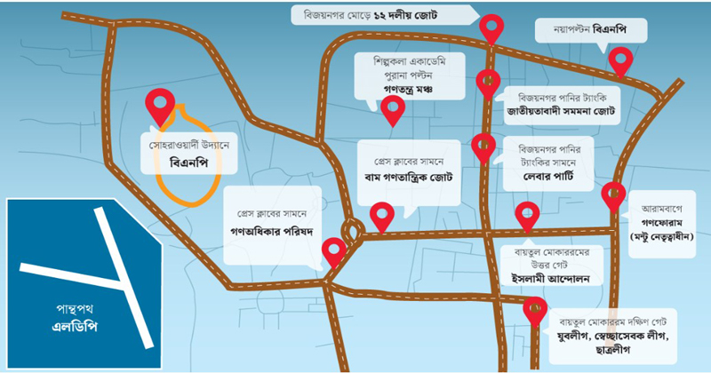 ২. মৎস্যভবন থেকে প্রেস ক্লাব হয়ে পল্টন রোড। শিল্পকলা একাডেমির সামনে গণতন্ত্র মঞ্চ, প্রেস ক্লাবের সামনে সমাবেশ করতে পারে গণঅধিকার পরিষদ ও বাম গণতান্ত্রিক জোট।