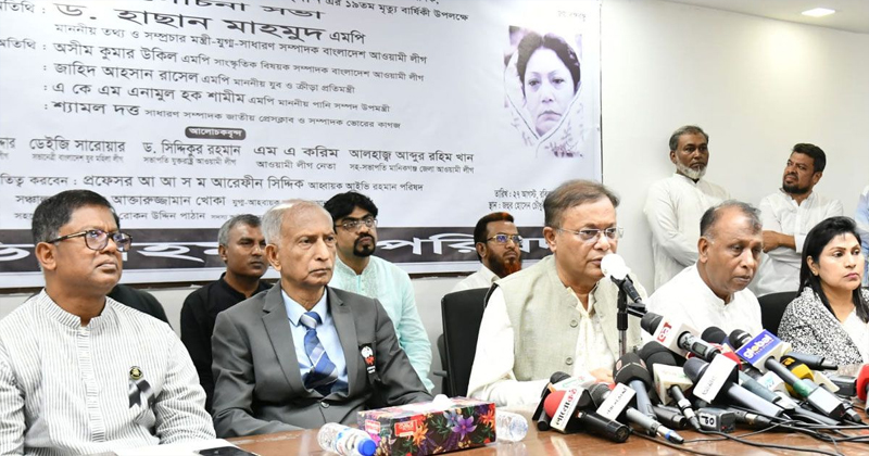 ১৯৭৫ সালে বঙ্গবন্ধু হত্যা এবং ২০০৪ সালে গ্রেনেড হামলার জন্য বিএনপি নেতাদের দায়ী করে হাছান মাহমুদ বলেন, ‘১৫ আগস্টের হত্যাকাণ্ড ঘটিয়েছে মুশতাক এবং জিয়া আর ২১ আগস্টের হত্যাকাণ্ড ঘটিয়েছে তারেক জিয়া। তারা আসলে হত্যার রাজনীতিটাই করে। হত্যার রাজনীতির মাধ্যমেই জিয়াউর রহমানের উত্থান এবং ক্ষমতা টিকে থাকার জন্য এই হত্যা সে অব্যাহত রেখেছিলো। তার বিরুদ্ধে যখনই সেনাবাহিনীতে অভ্যূত্থানের চেষ্টা হয়েছে তখনই নির্বিচারে সেনাবাহিনীর অফিসার এবং জওয়ানদের হত্যা করা হয়েছিলো। জিয়াউর রহমানের স্ত্রীর প্রতি সম্মান রেখেই বলতে চাই, বেগম খালেদা জিয়ার বিএনপি ১০ বছর ক্ষমতায় ছিলো কিন্তু জিয়া হত্যাকাণ্ডের বিচার হয় নাই। কারণ কেঁচো খুড়তে সাপ বের হবে সে জন্য।’