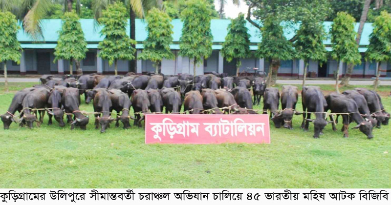 কুড়িগ্রামের উলিপুরে বর্ডার গার্ড বাংলাদেশ (বিজিবি) বিভিন্ন চরা লে অভিযান চালিয়ে ৪৫টি ভারতীয় মহিষ আটক করেছে। সোমবার (১৮ সেপ্টেম্বর) সকালে উপজেলার সীমান্তবর্তী সাহেবের আলগা ইউনিয়নের জাহাজের আলগা, মেকুরচর ও তার পার্শ^বর্তী এলাকা থেকে এসব মহিষ আটক করা হয়। যার আনুমানিক মূল্য ৭০ লাখ টাকা বলে জানা গেছে।