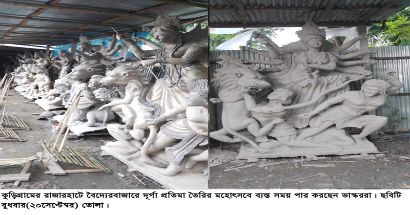 আর মাত্র ৩০দিন বাকি। ২০অক্টোবর শুক্রবার ষষ্ঠী পূজার মধ্য দিয়ে সনাতন হিন্দু ধার্মবলম্বীদের বড় উৎসব শারদীয় দূর্গাৎসব শুরু হবে। মঙ্গলভার(২৪) অক্টোবর দশমী বিহিত পূজা দিয়ে দূর্গাপূজার উৎসব সমাপ্ত ঘটবে। প্রতিবছর শরৎ ঋতুতে সনাতন হিন্দু ধর্মাবলম্বীদের শারদীয় দূর্গা উৎসব পালিত হয়। এ উৎসবকে কেন্দ্র করে দুই/তিন মাস আগে থেকেই কুড়িগ্রামের রাজারহাট উপজেলার ছিনাই ইউনিয়নের বৈদ্যের বাজার নামক স্থানে প্রতিমা কারিগররা (ভাস্কর) প্রতিমা তৈরির কাজ শুরু করেন। ইতিমধ্যে তারা কয়েকটি স্পটে পাঁচ শতাধিক দূর্গা মূতির কাজ সম্পন্ন করেছেন। এর মধ্যে দুরদুরান্ত থেকে আগত পূজা প্রস্তুত কমিটির লোকজন বেশ কিছু প্রতিমার বায়না দিয়েছেন বলে ভাস্কররা জানিয়েছেন। এছাড়া প্রতিদিনই দেশের বিভিন্ন অ ল থেকে প্রতিমা ক্রয় কিংবা দর্শন করতে ভীড় করছেন। ক্রেতাদের সুবিধার্থে ১৫বছর ধরে এ এলাকায় প্রতিমার হাট বসান প্রতিমার কারিগররা।