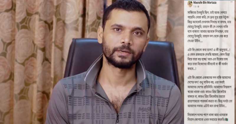 সামাজিক যোগাযোগ মাধ্যমে এক পোস্টে মাশরাফি লিখেছেন, ‘সাকিবের ইনজুরি ছিল, তাই আজ খেলতে পারেনি। দোয়া করি, সে দ্রুত সুস্থ হয়ে উঠুক। কিন্তু অনেকেই দেখলাম লিখছে বা বলছে, তার যেহেতু ইনজুরি, তাহলে কি সে খেলবে নাকি বসে থাকবে! আবার অনেকে লিখছেন, তার যেহেতু ইনজুরি, তাহলে দল থেকে বের করে দেওয়া উচিত।