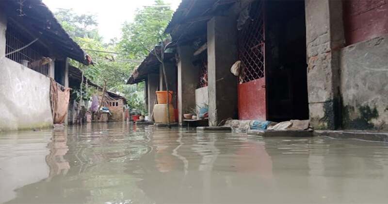 ফসলি জমি পানিতে তলিয়ে আছে। চরম দুর্ভোগের মধ্যে মানুষ চলাচল করছে।
