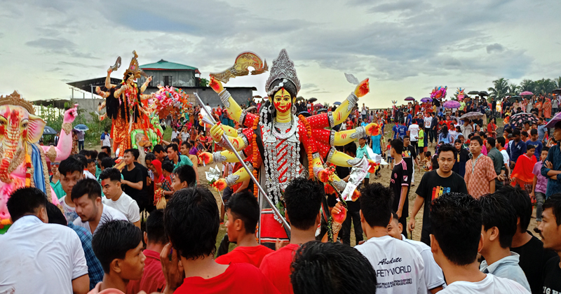 মঙ্গলবার (২৪ অক্টোবর) ভোর থেকেই মন্ডপে মন্ডপে আনন্দ ও বিষাদমাখা অনুভূতিতে পূর্ণ ছিলো দেবী দুর্গা প্রাঙ্গণ। খাগড়াছড়ি জেলা শহরের মন্ডপে মন্ডপে সকাল ১০টার মধ্যে পূজা শেষে হয়েছিল পুষ্পাঞ্জলি, আরতি ও মন্ত্রপাঠ। এরপর সিঁদুর খেলা শেষে বিকালে মন্ডপ থেকে প্রতিমাগুলো নামিয়ে আনার পরপরেই শোভাযাত্রা বের করা হয়। পরে শহরের চেঙ্গী নদীতে বিসর্জন দেয়া হয়।