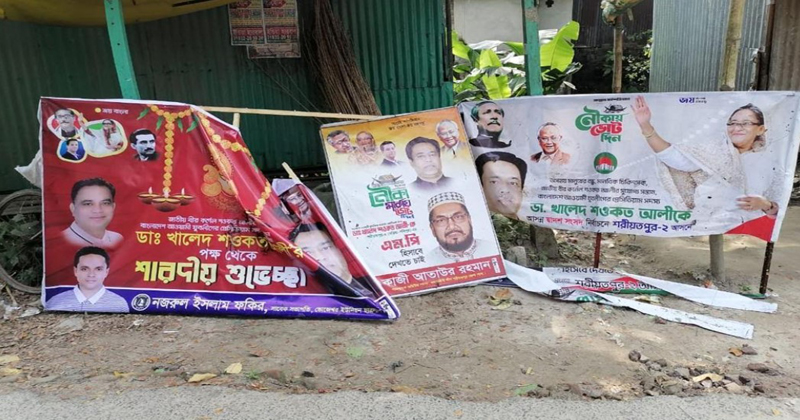 শরীয়তপুর-২ (নড়িয়া-সখিপুর) আসনে বাংলাদেশ আওয়ামী লীগের দলীয় মনোনয়ন প্রত্যাশী ও বাংলাদেশ আওয়ামী যুবলীগের প্রেসিডিয়াম সদস্য ডা. খালেদ শওকত আলীর নৌকা প্রতীক, জাতির জনক বঙ্গবন্ধু শেখ মুজিবুর রহমান ও প্রধানমন্ত্রী শেখ হাসিনার ছবি সম্বলিত মনোনয়ন প্রত্যাশীর ব্যানার ফেস্টুন ছিঁড়ে ফেলার অভিযোগ উঠেছে। শুক্রবার (২৬ অক্টোবর) রাতে নড়িয়া উপজেলার বিভিন্ন স্থানে লাগানো ব্যানার ফেস্টুন কেটে ও ছিরে ফেলে দূর্বৃত্তরা।