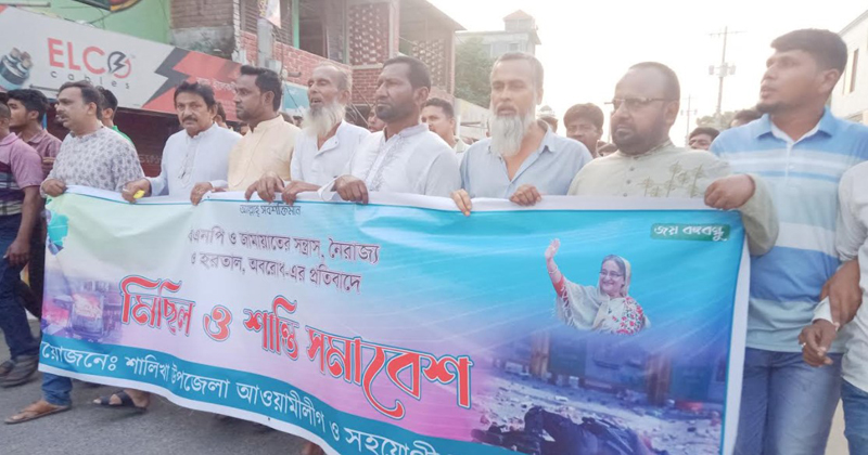 দেশব্যাপী বিএনপি ও জামাতের সন্ত্রাস, নৈরাজ্য, হরতাল ও অবরোধের প্রতিবাদে মাগুরার শালিখায় উপজেলা আওয়ামীলীগ ও এর বিভিন্ন অঙ্গ সংগঠনের আয়োজনে মিছিল ও শান্তি সমাবেশ অনুষ্ঠিত হয়েছে। মিছিলটি উপজেলা মুক্তমঞ্চ থেকে শুরু হয়ে আড়পাড়া বাজারের বিভিন্ন সড়ক প্রদক্ষিণ করে স্বস্থানে গিয়ে শেষ হয়।