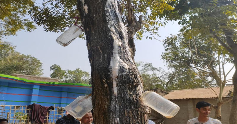এমন চিত্রের দেখা মেলেছে চাঁপাইনবাবগঞ্জ সদর উপজেলার চরবাগডাঙ্গা ইউনিয়নের গড়াইপাড়া গ্রামের নাসির আলীর বাড়ির উঠোনে। তার বাবার নাম মৃত মো. কালু। প্রায় দুইদশক আগে গাছটি উঠোনে লাগানো হয়। এখনই সেই গাছ থেকে মিলছে খেজুরের স্বাদের মতোই মিষ্টি রস। অনেকেই রোগবালাই মুক্তির আশায় এই রস সংগ্রহে ভীড় করছেন।