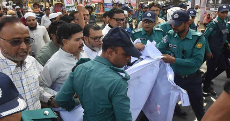 সরেজমিন দেখা যায়, বেলা ১১টার দিকে ১২ দলীয় জোটের নেতাকর্মীরা সমাবেশের জন্য জাতীয় প্রেসক্লাবের সামনের ফুটপাতে জড়ো হতে থাকেন। এ সময় তারা স্লোগানও দিতে থাকেন। এক পর্যায়ে পুলিশ এসে তাদের ব্যানার ছিনিয়ে নেয় এবং জোট নেতাদের সঙ্গে বাকবিতণ্ডায় জড়িয়ে পড়েন। পরে নেতারা পুলিশি বাধায় সমাবেশ না করে বিক্ষোভ মিছিল শুরু করেন।