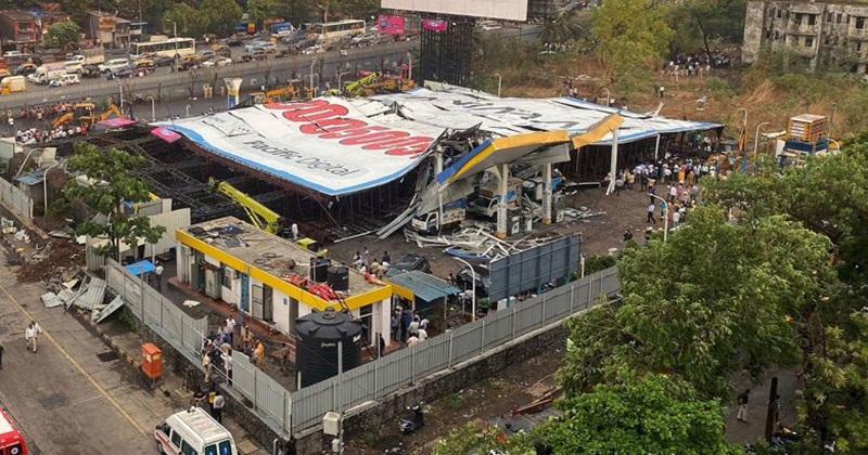 মুম্বাইয়ের ঘাটকোপার এলাকায় একটি জ্বালানি স্টেশনের বিপরীতে অবস্থিত ১০০ ফুট বিলবোর্ডটি সোমবার সন্ধ্যায় ঝড়ের তাণ্ডবে প্রচণ্ড জোরে বিধ্বস্ত হয় নিচের জ্বালানি স্টেশনে।